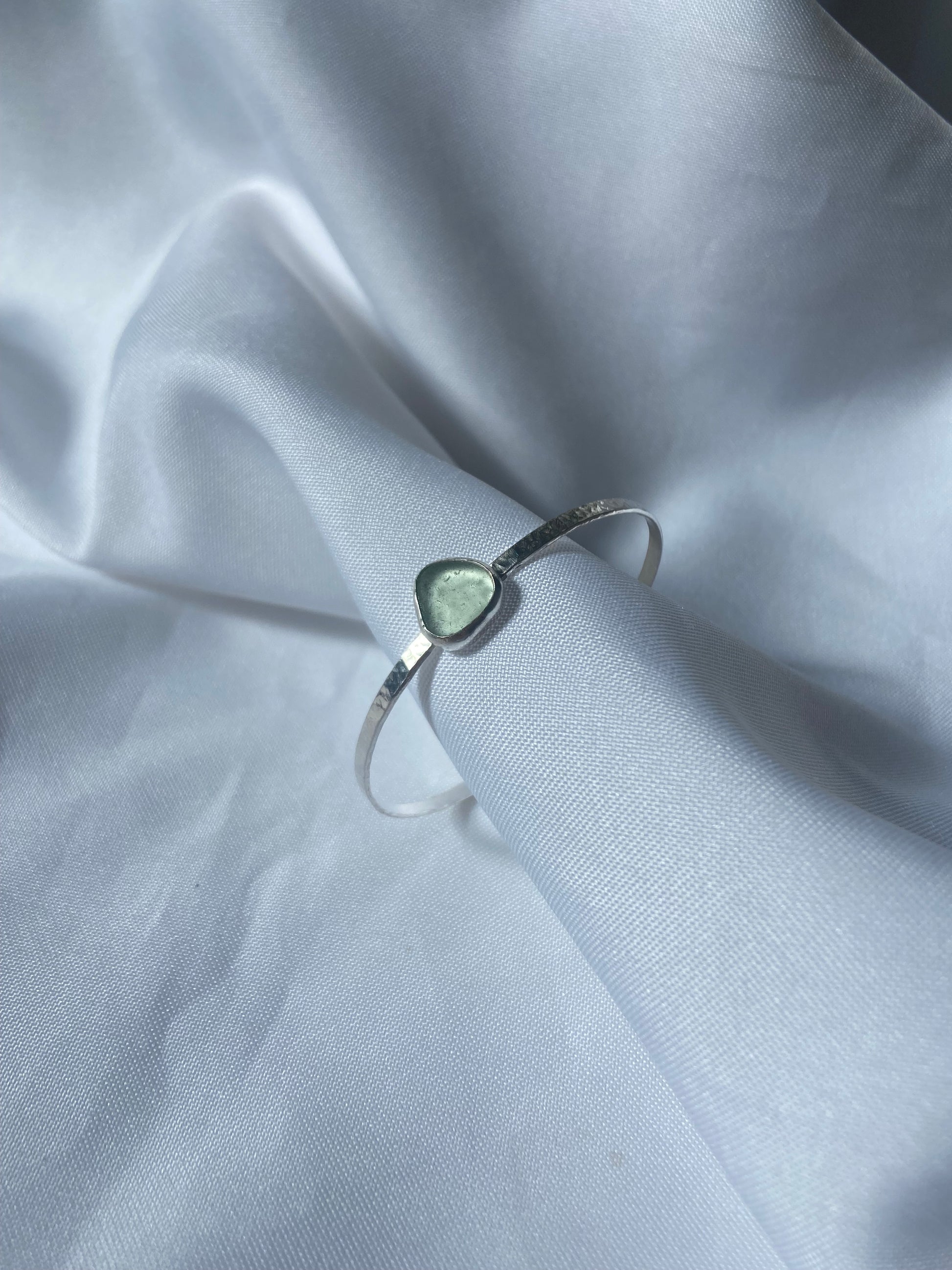 Aqua blue sea-glass on a hammered cuff, handcrafted in 925 sterling silver.