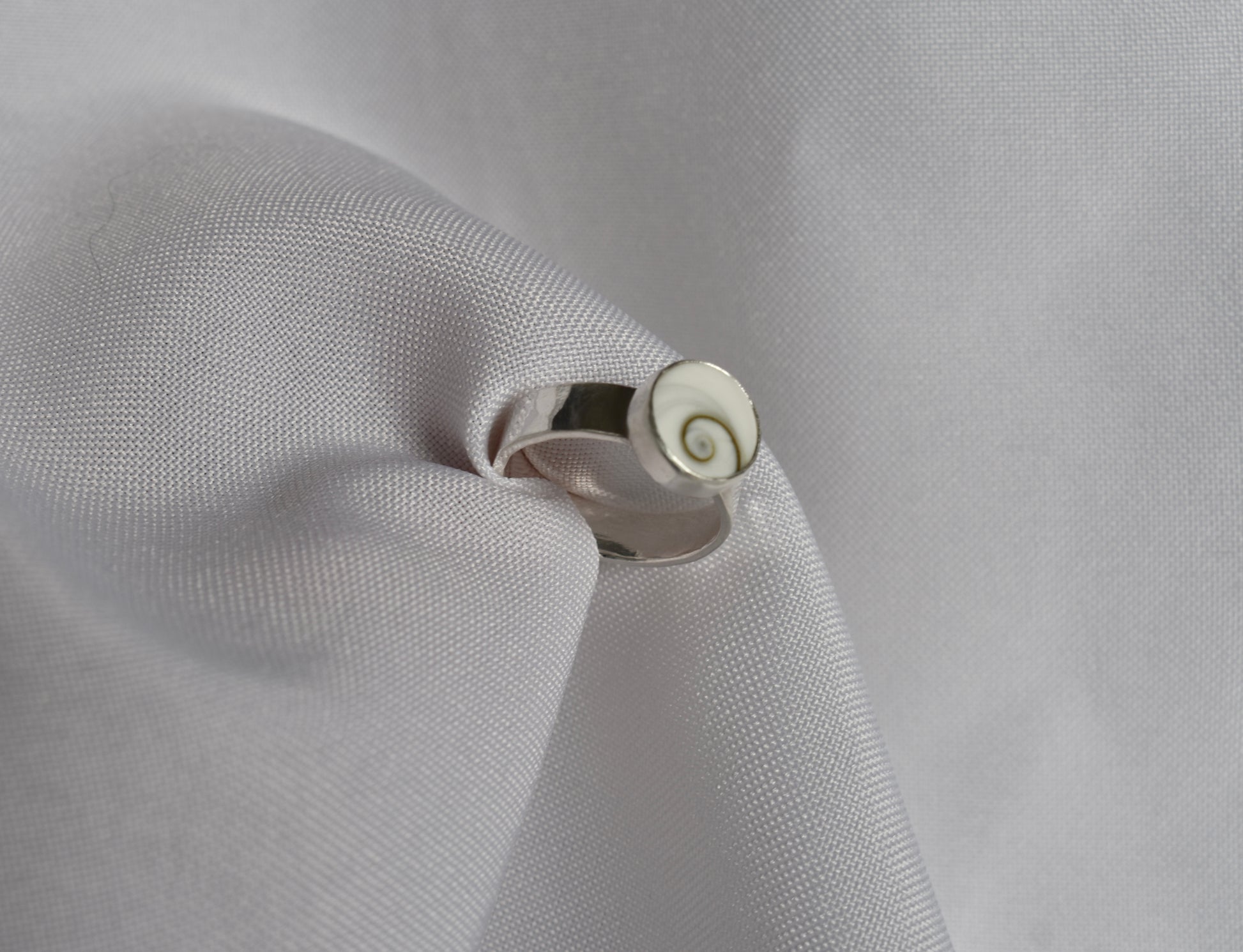 This ring features a piece of Shiva shell on a thick, gently textured band that sparkles in the light. Handcrafted with 925 sterling silver. Size Q.