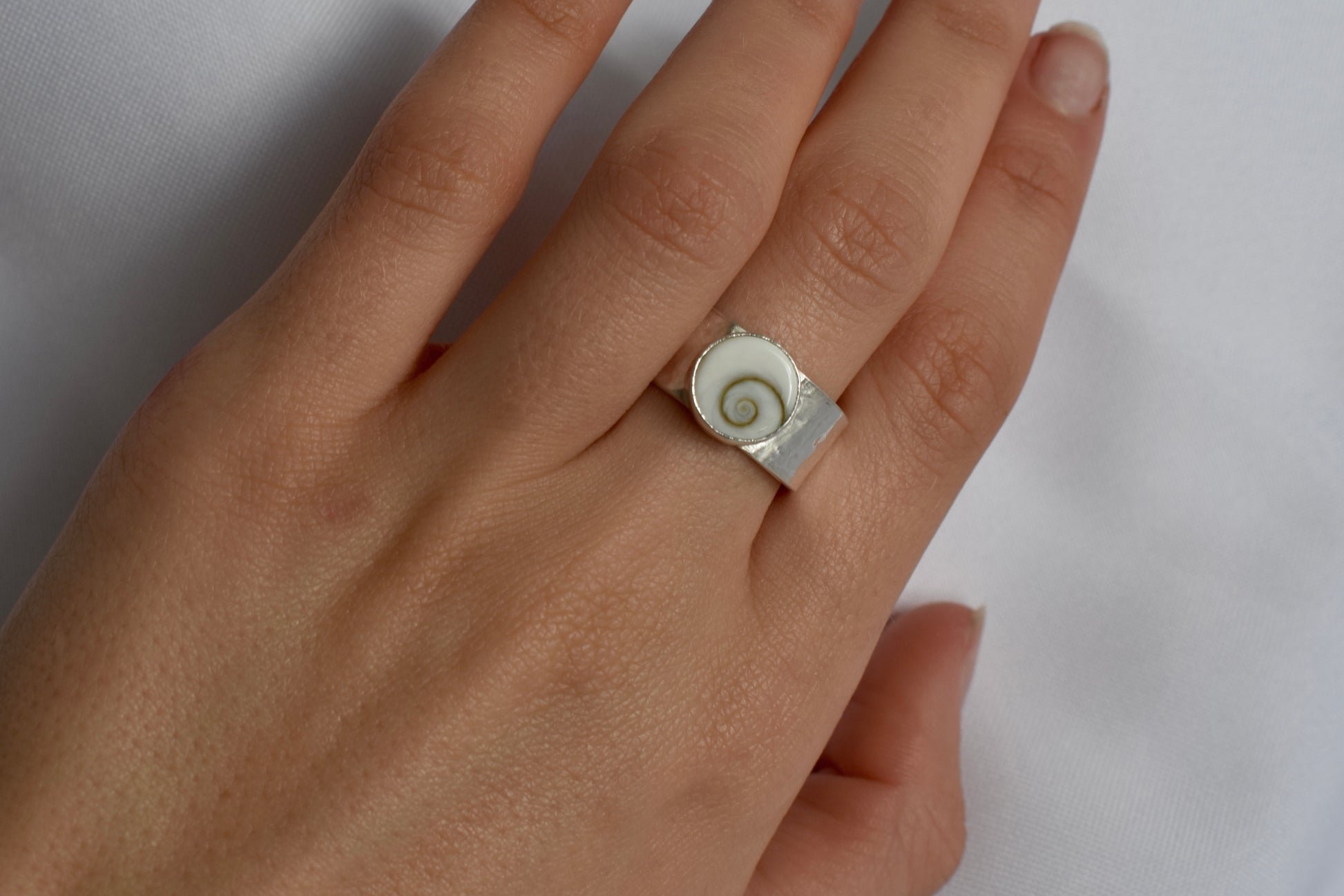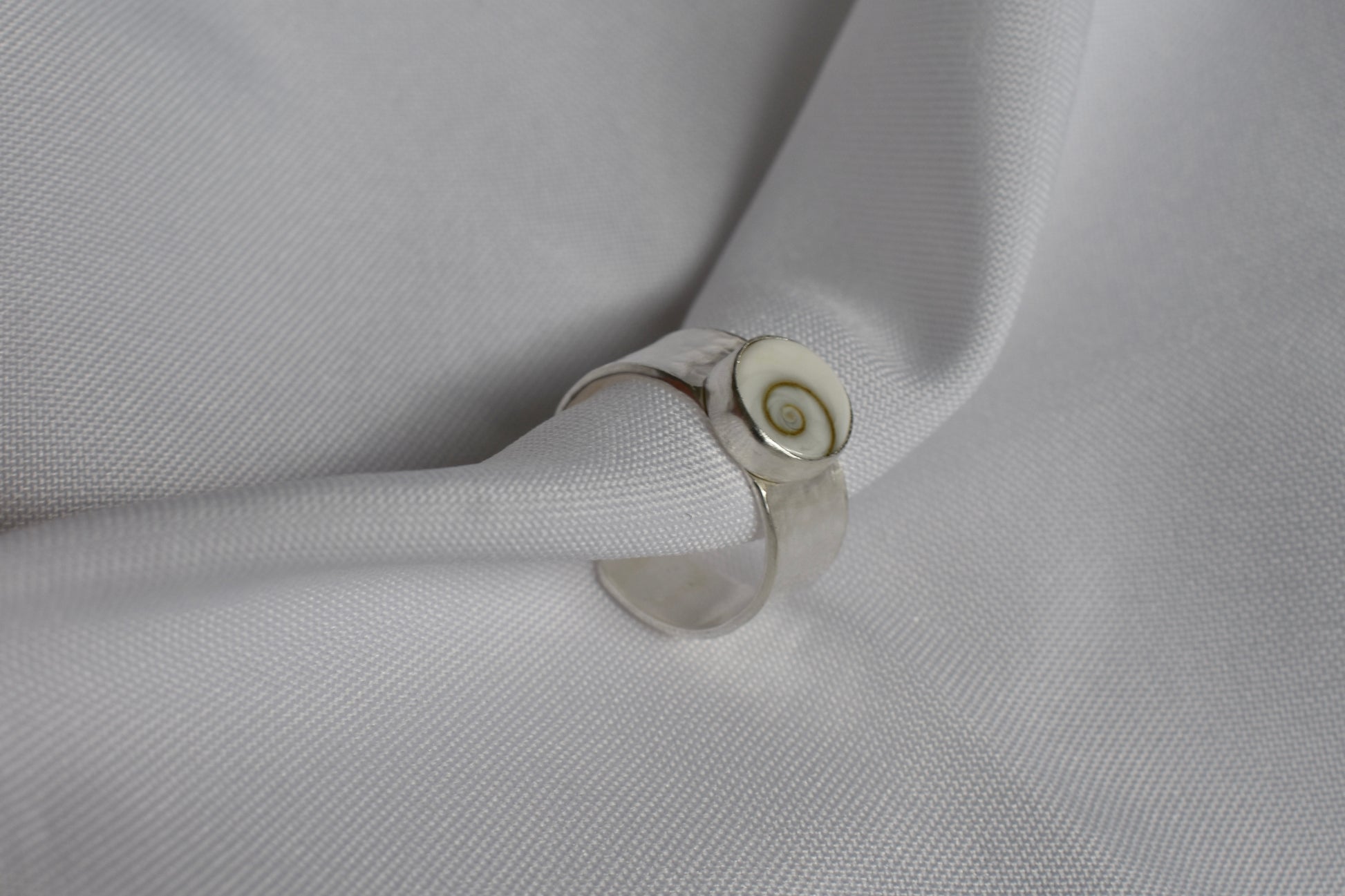 This ring features a piece of Shiva shell on a thick, textured band that sparkles in the light, open at the back to allow you to find the perfect fit. Handcrafted with 925 sterling silver. Size range R-V.
