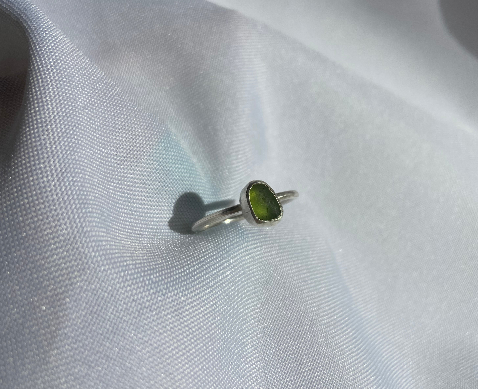 Grass green sea-glass ring, handcrafted in 925 sterling silver. Size Q