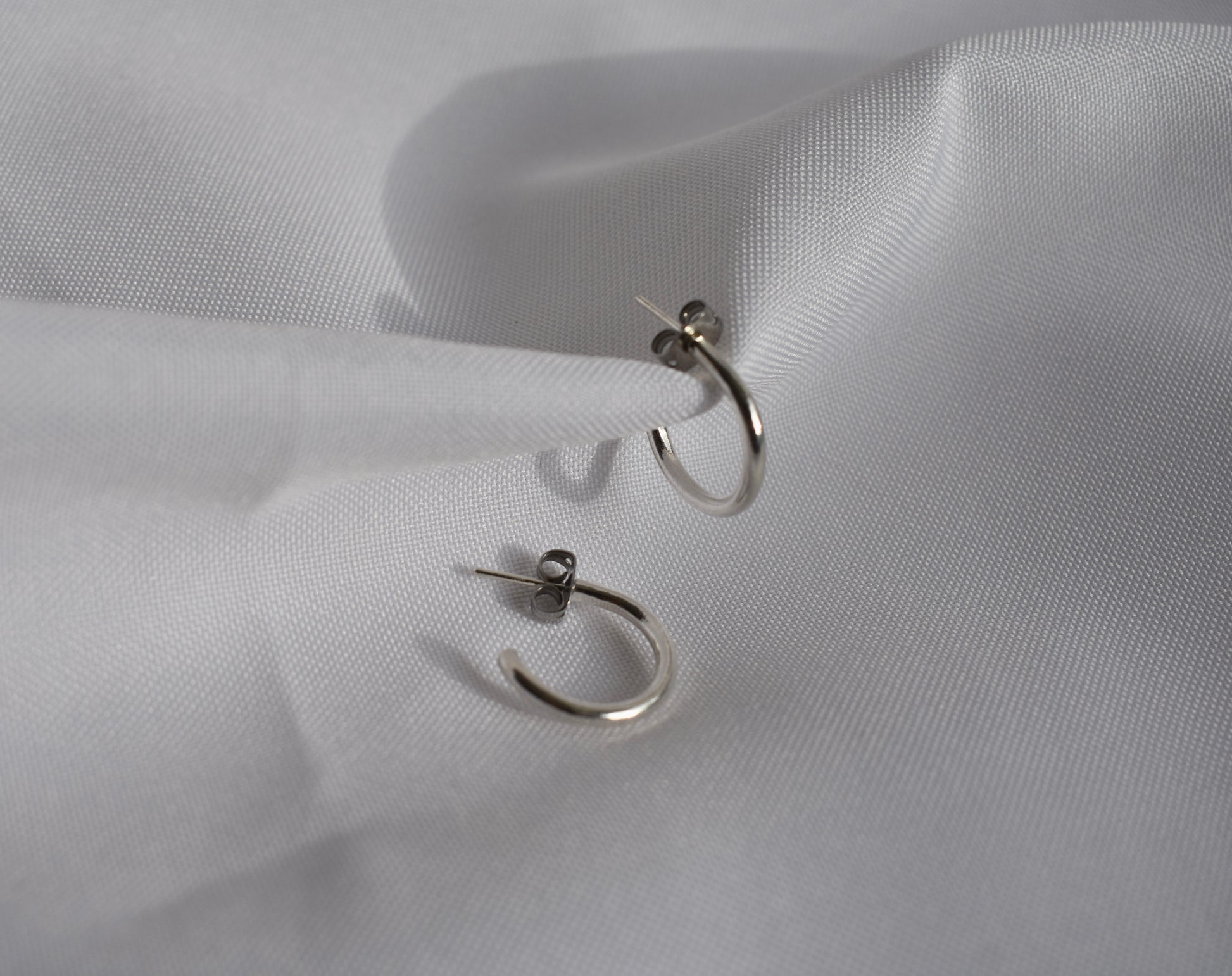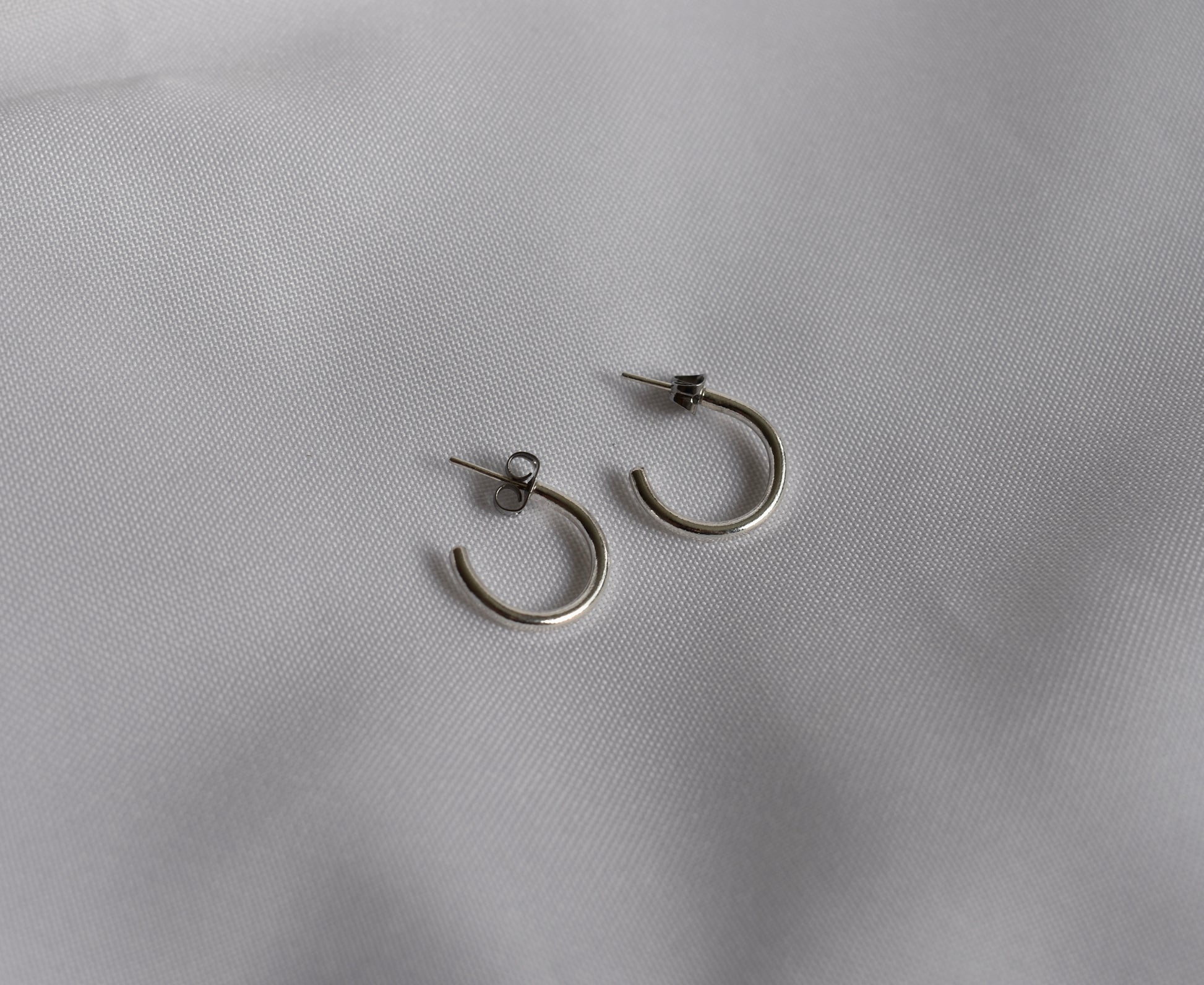 Simple hoop earrings with stud back, handcrafted in sterling silver. 2mm thick, approximately 1.5cm diameter.