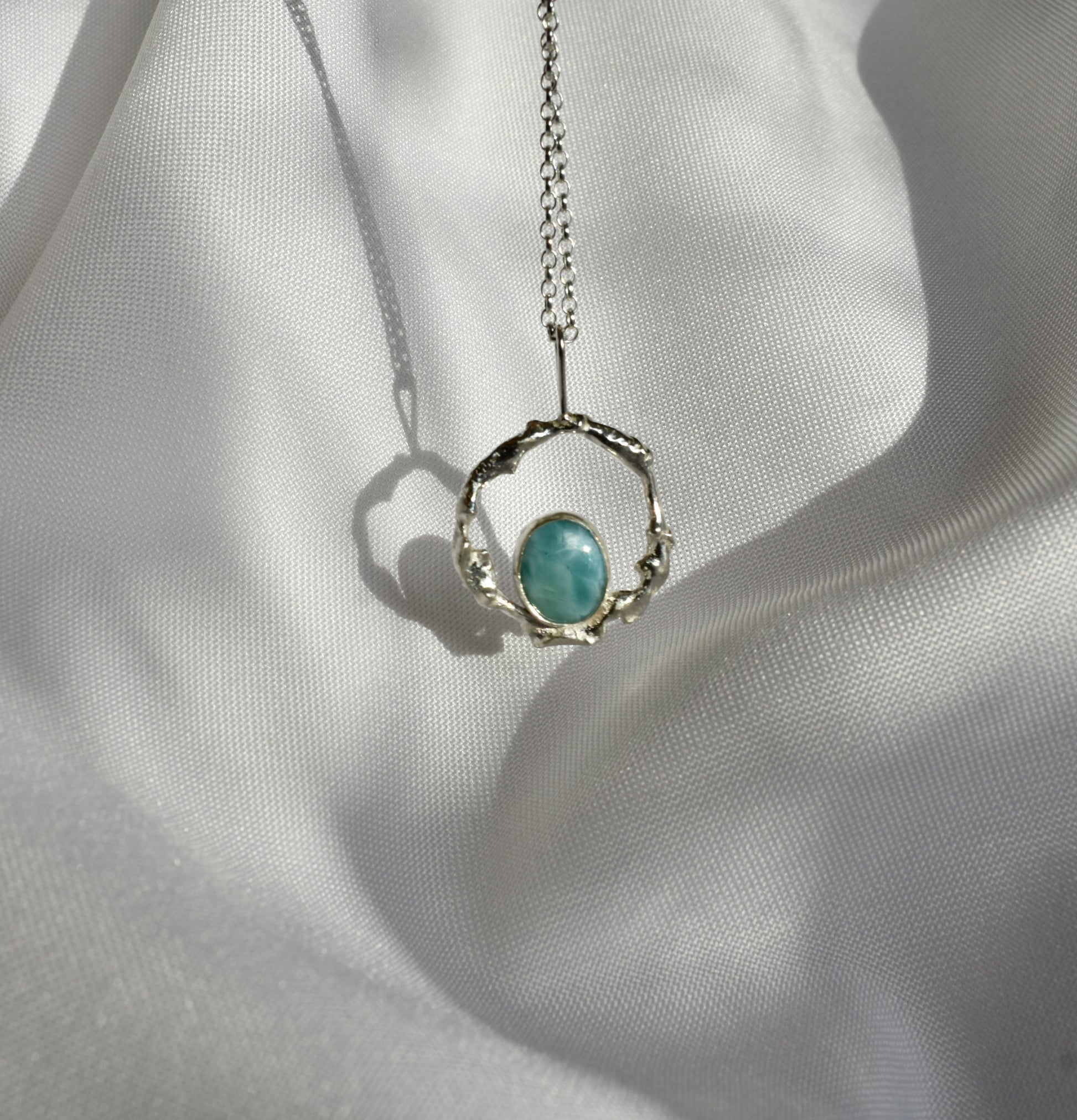 A beautiful Larimar stone sits in the centre of a molten silver ring that ebbs and flows like sunlight on water. Handcrafted in 925 sterling silver. 18" chain included, please get in touch upon purchase to alter the length of the chain for no extra cost.
