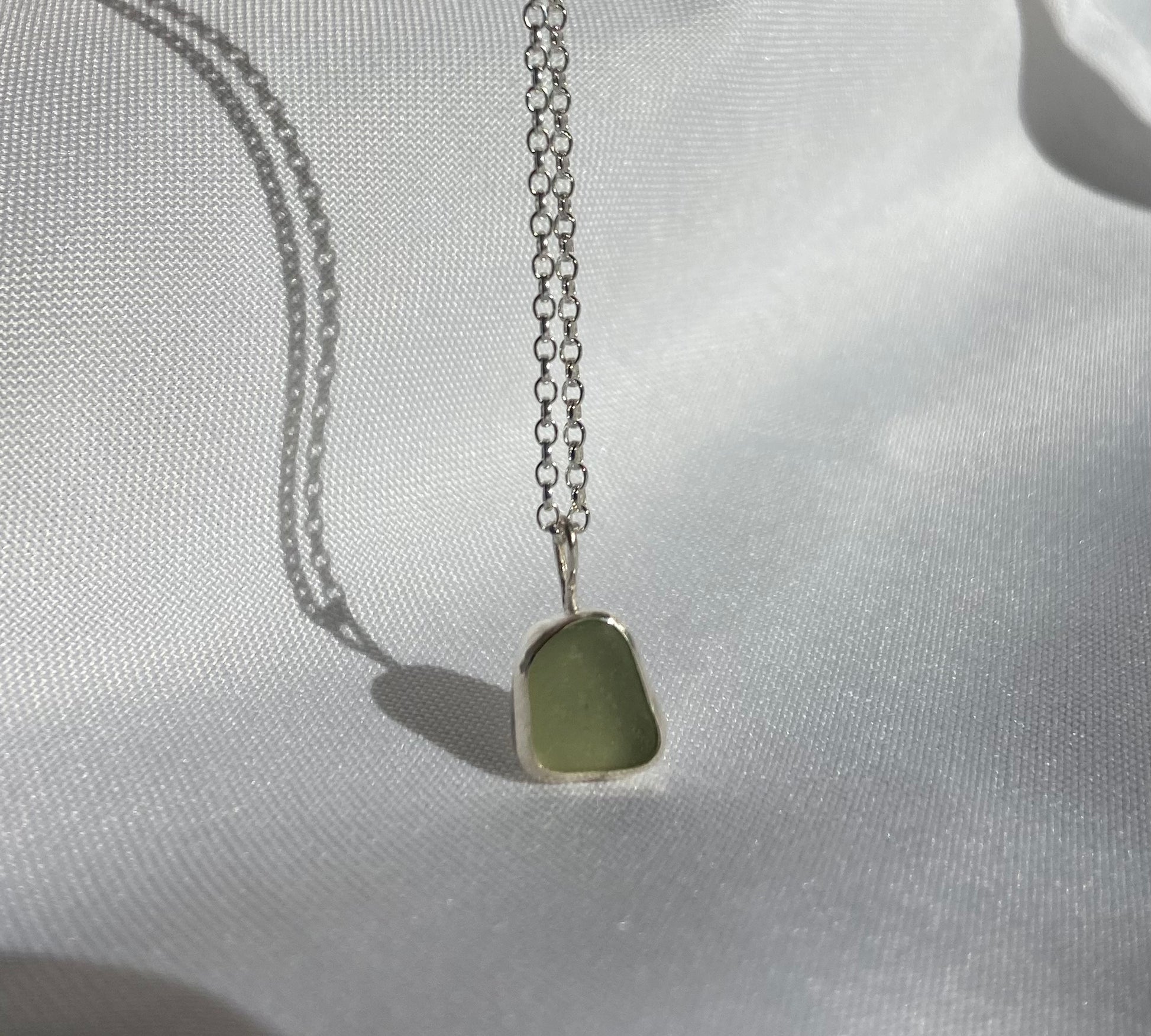 Seafoam sea-glass set in 925 sterling silver. 18” Chain included.