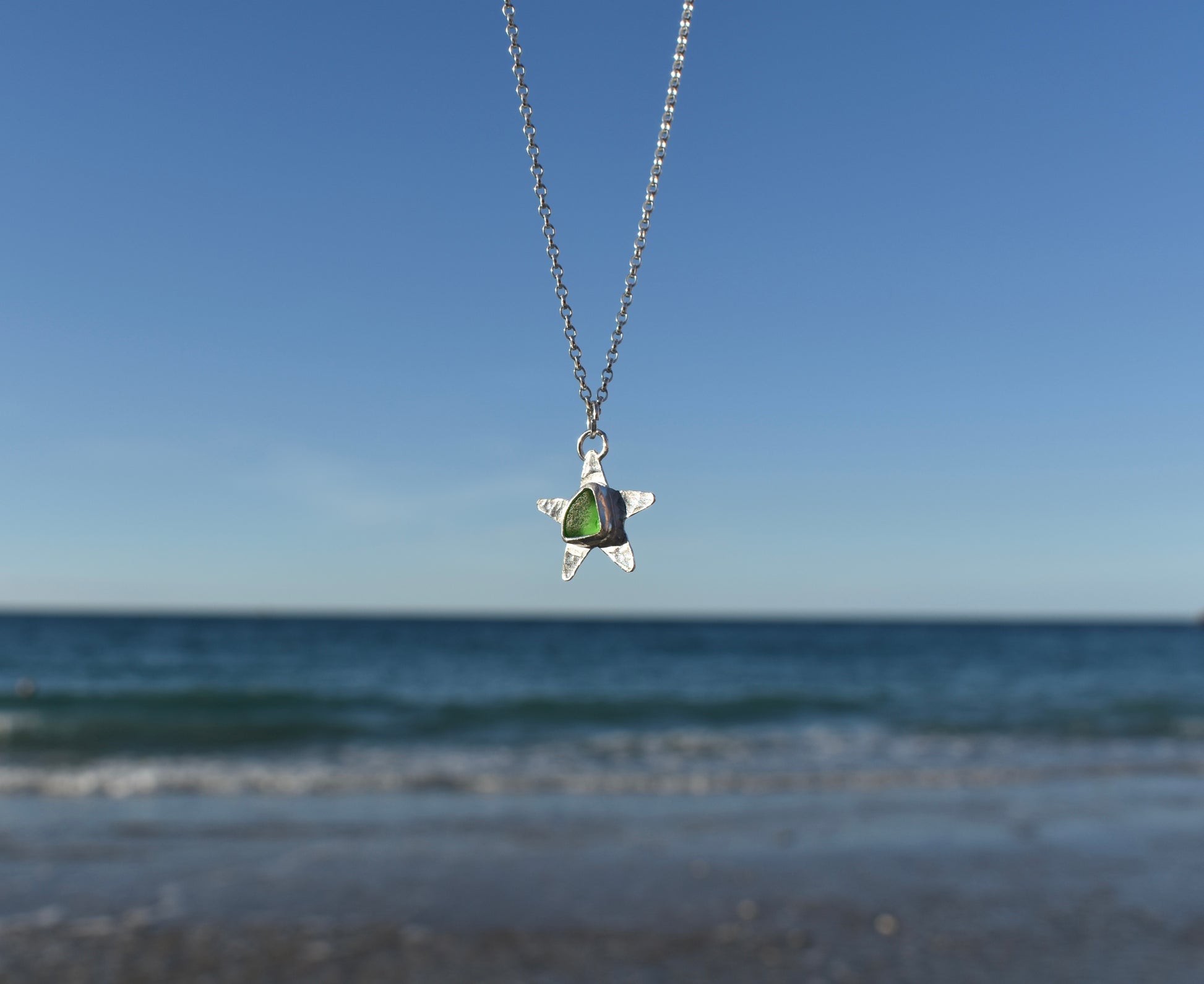 Bottle green sea-glass on a hammered starfish pendant. Handmade in sterling silver. 18” chain included.