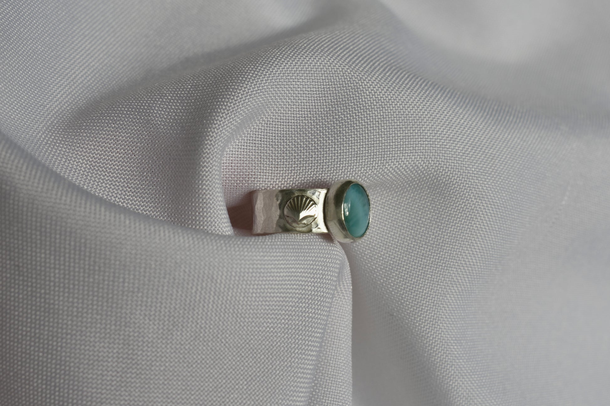 This ring features a gorgeous piece of Larimar stone accompanied by silver seashells on either side to perfectly frame it. This ocean-inspired combo sit on a textured band that sparkles in the light. Handcrafted with 925 sterling silver. Size K.